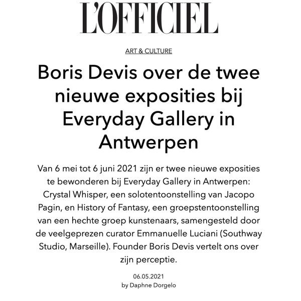 7th Edition May 13, 2021During Antwerp Art Weekend' 7th edition, Everyday Gallery showcases two exhibitions both curated by Emmanuelle Luciani. 'History Of Fantasy' a group exhibiton and 'Crystal Whisper'...Read more