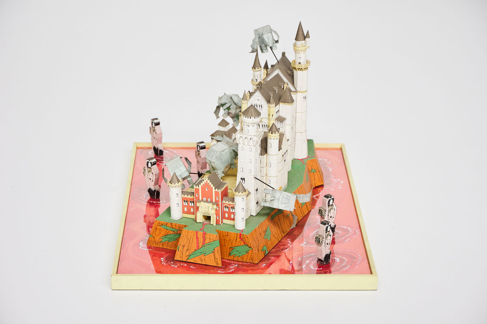 With the same social-critical view, we find ourselves back in the assemblages Lichtenstein in Neuschweinstein and Monument to the Brandenburg Gate (both 1995), which provide a commentary on the unified Germany and the end of the cold war. Even after the fall of the wall, the (now discarded) statues of Vladimir Ilyich Lenin begin to circulate in the West. They turn up at scrap dealers, trinket shops and antique dealers. The fact that a political leader who was once revered and worshiped by almost the entire leftwing in politics is now despised, cast aside and can be bought in thrift stores, is reason enough for Minnen to start playing with this figure. In ‘Op Avontuur met Lenin’ (2016) he does not portray Lenin as a sort of Tintin-like adventurer who played a relevant role during all sorts of essential moments in decolonial and local history: from the